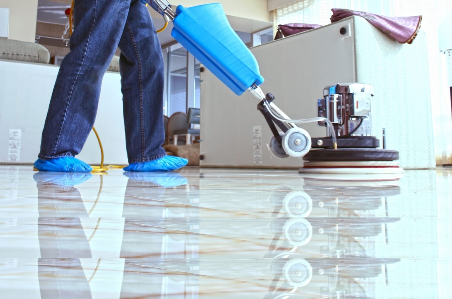 Машинно почистване и полиране на твърди подови настилки за блясък и дълготрайна защита.
